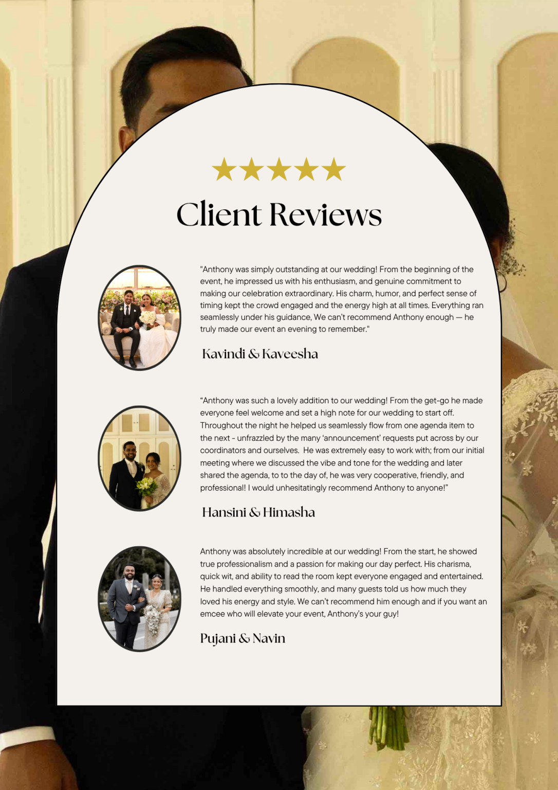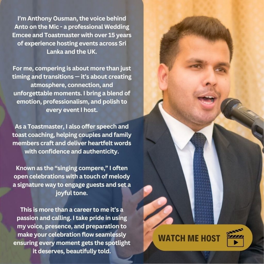Your wedding is a collection of moments — from grand entrances and heartfelt toasts to the first dance, cake cutting, and joyful surprises. Each detail reflects your love and gratitude for family, friends, and colleagues. As your emcee, Anto on the Mic brings warmth, elegance, and energy, guiding guests and bringing every plan to life. Anto’s emceeing includes drafting and coaching speeches or toasts, helping couples and planners create a seamless, unforgettable, and beautifully remembered celebration.